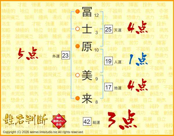 冨(12画)士(3画)原(10画) 美(9画)来(8画)