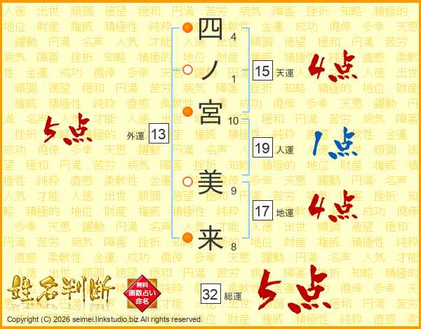 生活面を象徴する運勢です。外部から受ける影響力を表し、結婚運、家庭運や職場、環境への順応性を表します。総運から人運を引いた画数。姓や名が1文字の場合を除く。