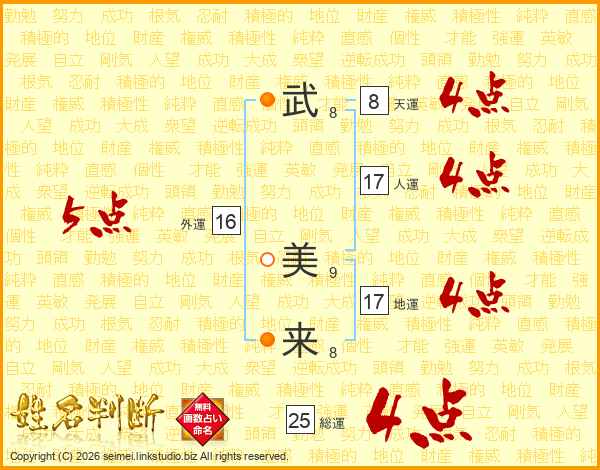 武(8画) 美(9画)来(8画)