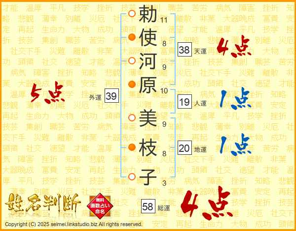 勅(11画)使(8画)河(9画)原(10画) 美(9画)枝(8画)子(3画)