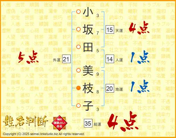 小(3画)坂(7画)田(5画) 美(9画)枝(8画)子(3画)