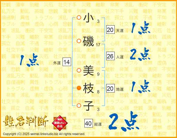 小(3画)磯(17画) 美(9画)枝(8画)子(3画)