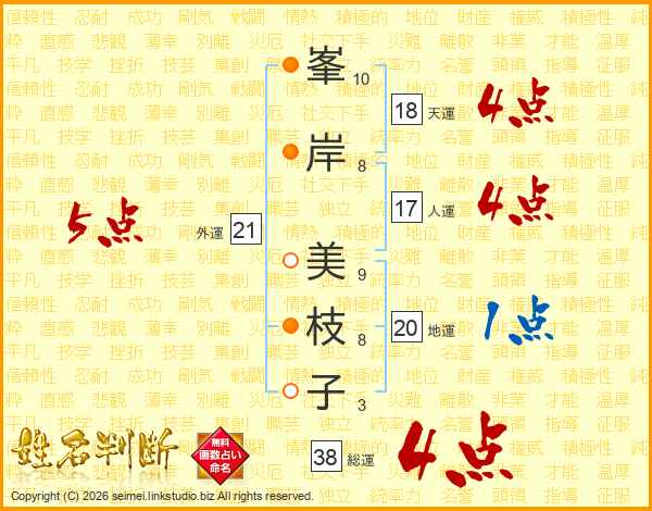 峯(10画)岸(8画) 美(9画)枝(8画)子(3画)