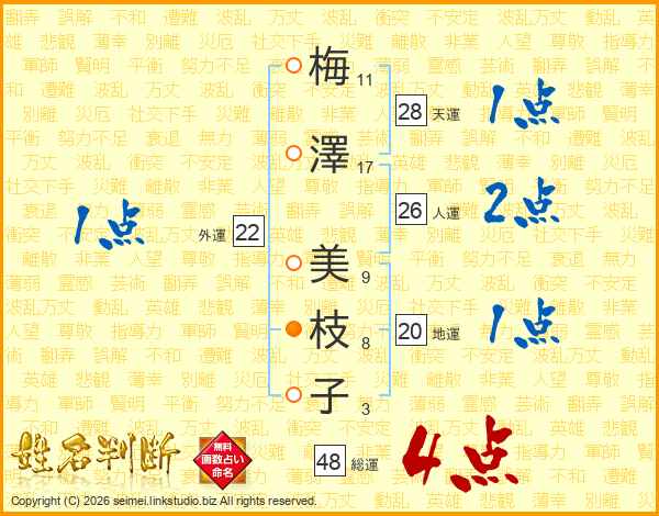 梅(11画)澤(17画) 美(9画)枝(8画)子(3画)