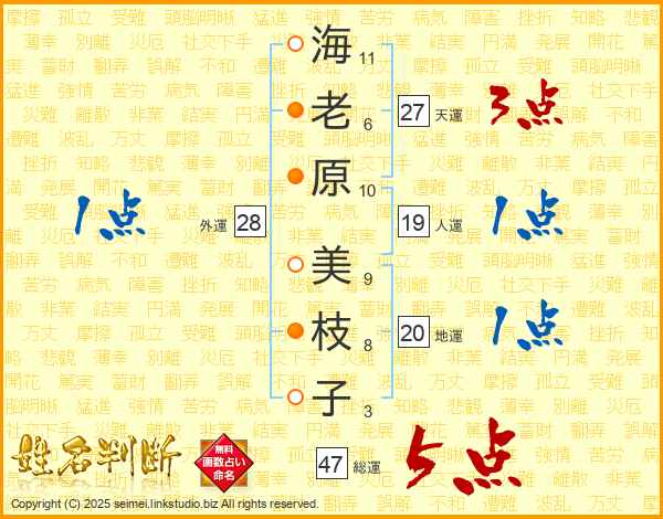 海(11画)老(6画)原(10画) 美(9画)枝(8画)子(3画)