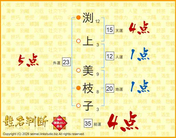渕(12画)上(3画) 美(9画)枝(8画)子(3画)