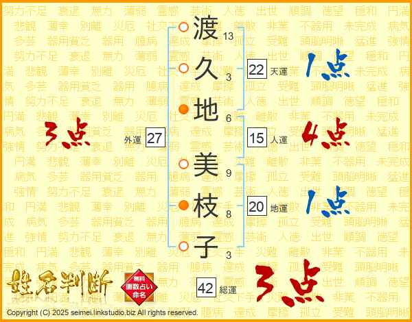 渡(13画)久(3画)地(6画) 美(9画)枝(8画)子(3画)