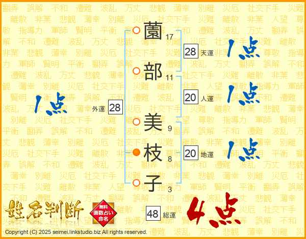 薗(17画)部(11画) 美(9画)枝(8画)子(3画)