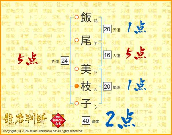 飯(13画)尾(7画) 美(9画)枝(8画)子(3画)