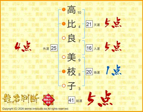 高(10画)比(4画)良(7画) 美(9画)枝(8画)子(3画)