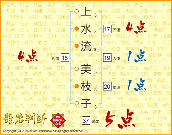 上(3画)水(4画)流(10画) 美(9画)枝(8画)子(3画)