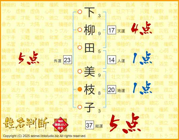 下(3画)柳(9画)田(5画) 美(9画)枝(8画)子(3画)