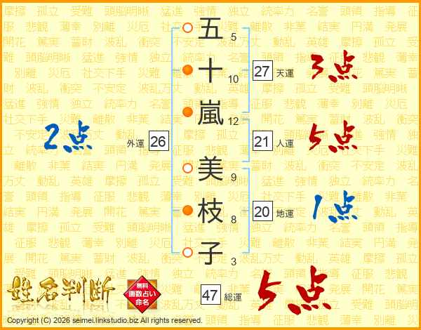 五(5画)十(10画)嵐(12画) 美(9画)枝(8画)子(3画)