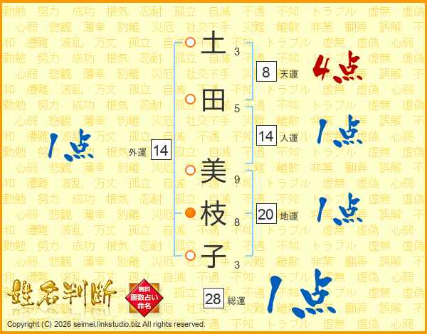 土(3画)田(5画) 美(9画)枝(8画)子(3画)