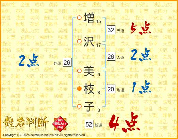 増(15画)沢(17画) 美(9画)枝(8画)子(3画)