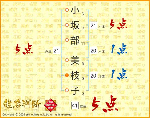 小(3画)坂(7画)部(11画) 美(9画)枝(8画)子(3画)
