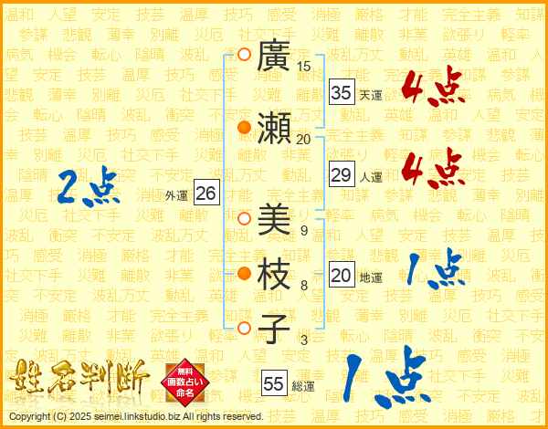 廣(15画)瀬(20画) 美(9画)枝(8画)子(3画)