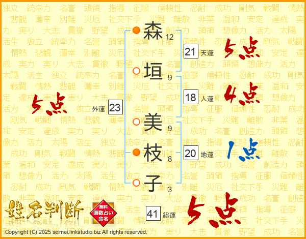 森(12画)垣(9画) 美(9画)枝(8画)子(3画)