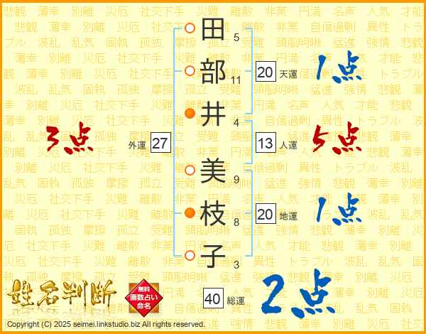 田(5画)部(11画)井(4画) 美(9画)枝(8画)子(3画)