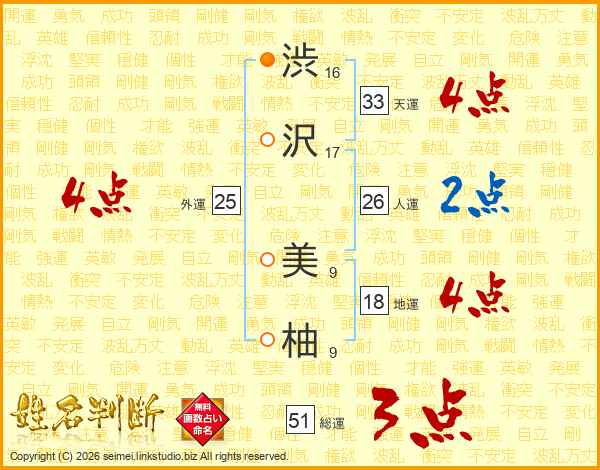 渋(16画)沢(17画) 美(9画)柚(9画)