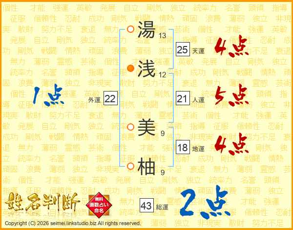 湯(13画)浅(12画) 美(9画)柚(9画)