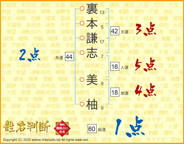 裏(13画)本(5画)謙(17画)志(7画) 美(9画)柚(9画)