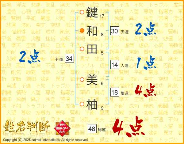 鍵(17画)和(8画)田(5画) 美(9画)柚(9画)