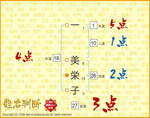 一(1画) 美(9画)栄(14画)子(3画)