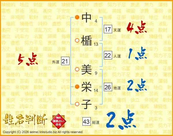 中(4画)楯(13画) 美(9画)栄(14画)子(3画)