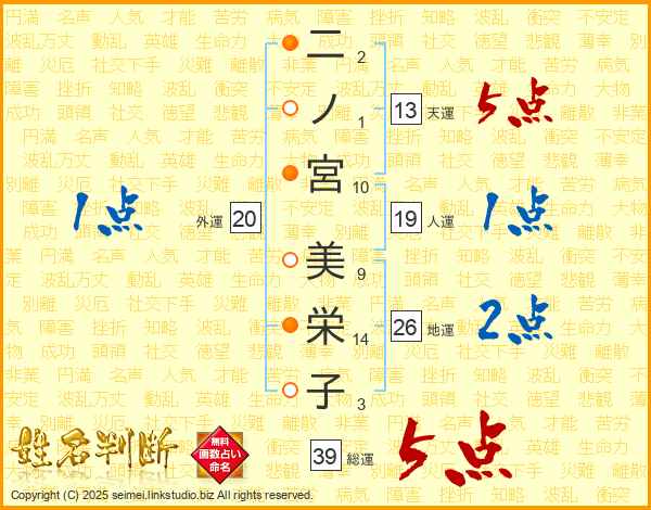二(2画)ノ(1画)宮(10画) 美(9画)栄(14画)子(3画)
