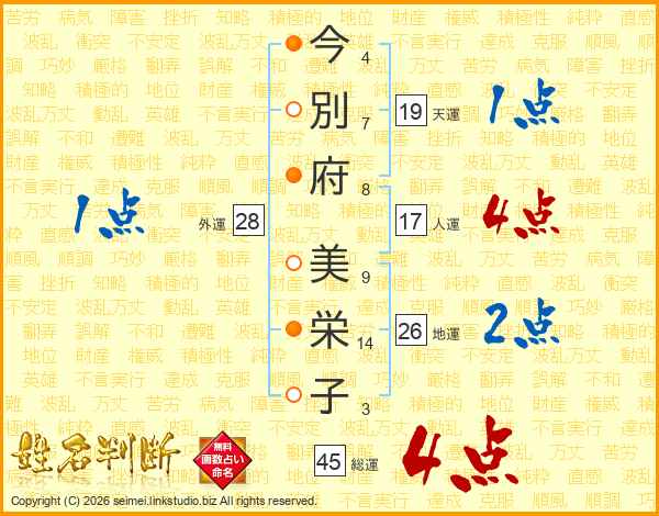 今(4画)別(7画)府(8画) 美(9画)栄(14画)子(3画)