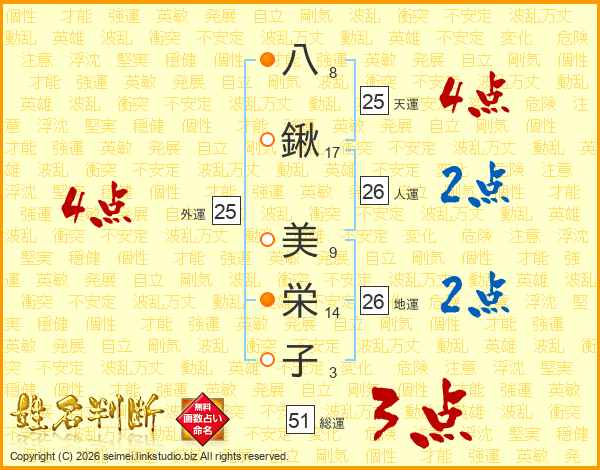 八(8画)鍬(17画) 美(9画)栄(14画)子(3画)