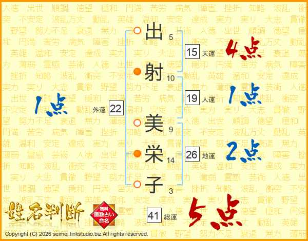 出(5画)射(10画) 美(9画)栄(14画)子(3画)