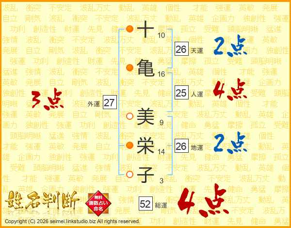 十(10画)亀(16画) 美(9画)栄(14画)子(3画)