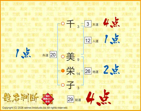 生活面を象徴する運勢です。外部から受ける影響力を表し、結婚運、家庭運や職場、環境への順応性を表します。総運から人運を引いた画数。姓や名が1文字の場合を除く。