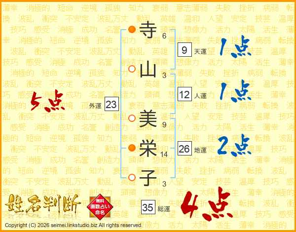 寺(6画)山(3画) 美(9画)栄(14画)子(3画)
