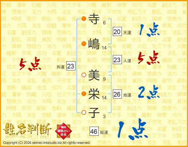 寺(6画)嶋(14画) 美(9画)栄(14画)子(3画)