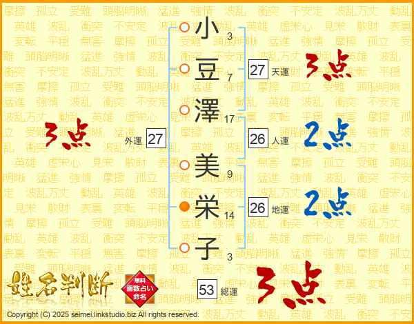 小(3画)豆(7画)澤(17画) 美(9画)栄(14画)子(3画)