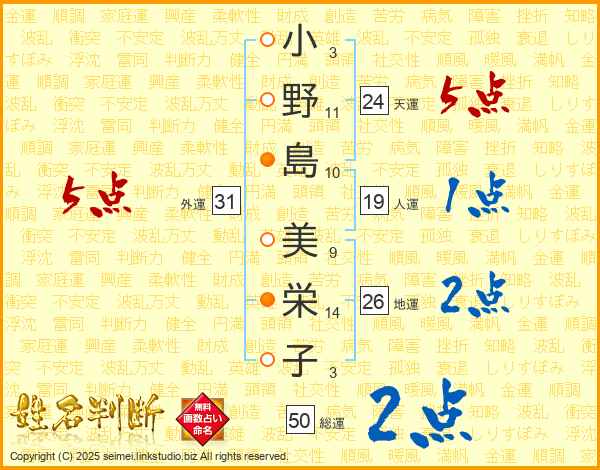 小(3画)野(11画)島(10画) 美(9画)栄(14画)子(3画)