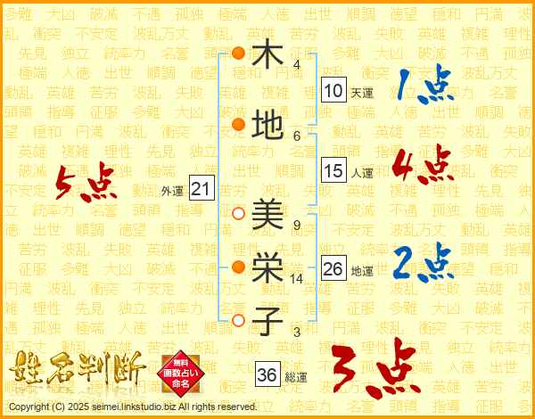 木(4画)地(6画) 美(9画)栄(14画)子(3画)