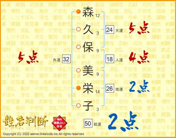 森(12画)久(3画)保(9画) 美(9画)栄(14画)子(3画)