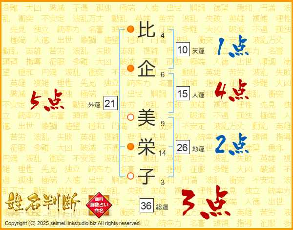比(4画)企(6画) 美(9画)栄(14画)子(3画)