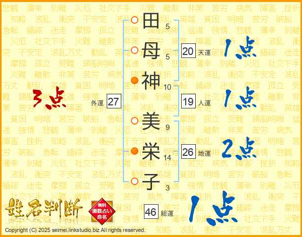 田(5画)母(5画)神(10画) 美(9画)栄(14画)子(3画)