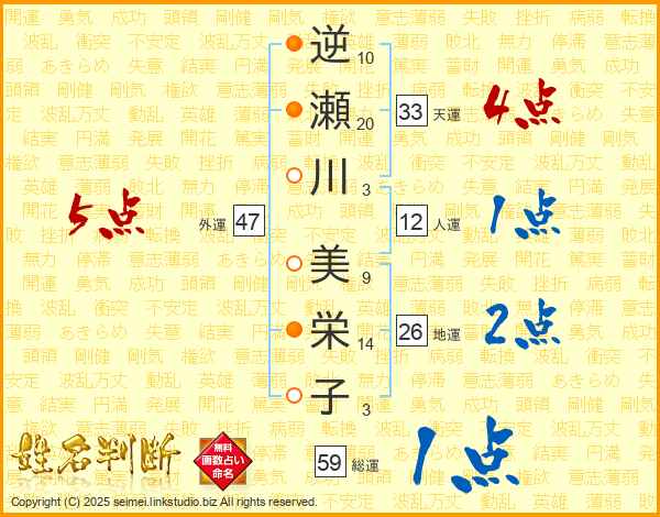 逆(10画)瀬(20画)川(3画) 美(9画)栄(14画)子(3画)