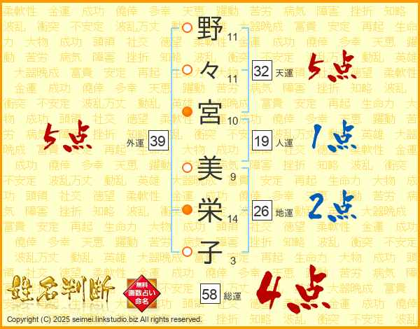 野(11画)々(11画)宮(10画) 美(9画)栄(14画)子(3画)