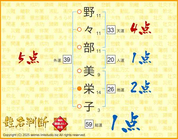 野(11画)々(11画)部(11画) 美(9画)栄(14画)子(3画)