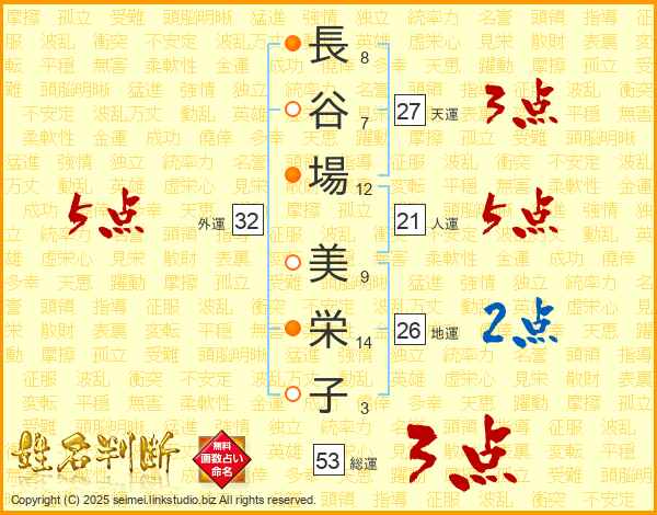 長(8画)谷(7画)場(12画) 美(9画)栄(14画)子(3画)