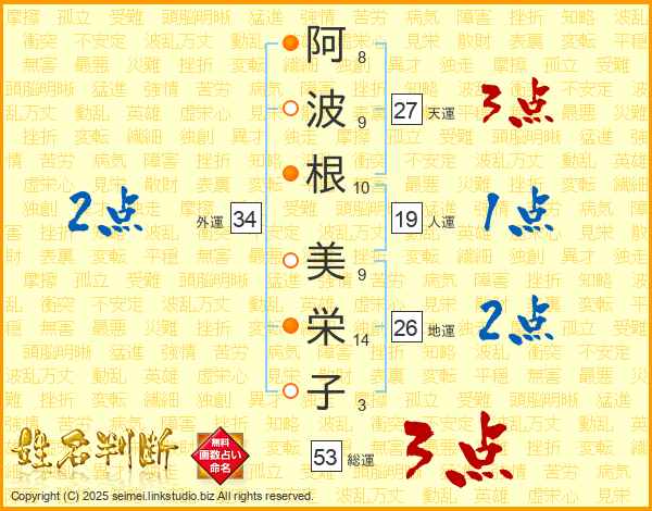 阿(8画)波(9画)根(10画) 美(9画)栄(14画)子(3画)