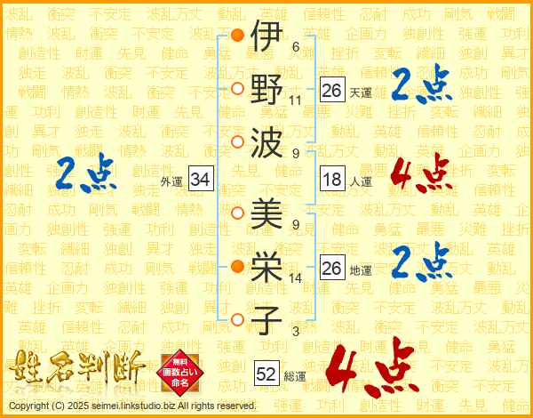 伊(6画)野(11画)波(9画) 美(9画)栄(14画)子(3画)