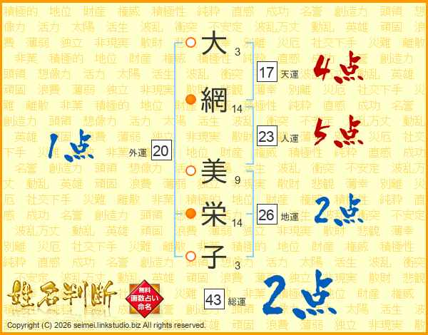 大(3画)網(14画) 美(9画)栄(14画)子(3画)